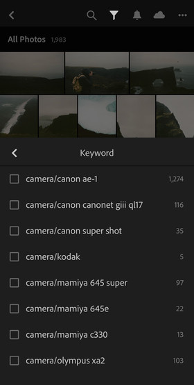 Lightroom iPhone app. You can use your keyword tags to filter or use Adobe's A.I. search.